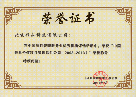 本次評選活動是根據中國項目管理服務業(yè)優(yōu)秀機構評價體系相關內容,經申報材料初評、各位專家組評委認真細致的評審、在《項目管理技術》媒介上進行公示,接受社會監(jiān)督等相關評獎程序,最終評選出“中國最具價值項目管理軟件(2003-2013)”企業(yè)。邦永科技作為業(yè)內備受企業(yè)贊譽的項目管理軟件企業(yè),憑借專業(yè)的技術能力、突出的業(yè)績貢獻、優(yōu)質的服務水平與質量和良好的客戶評價等方面最終入圍“中國最具價值項目管理軟件(2003-2013)”企業(yè)獎。