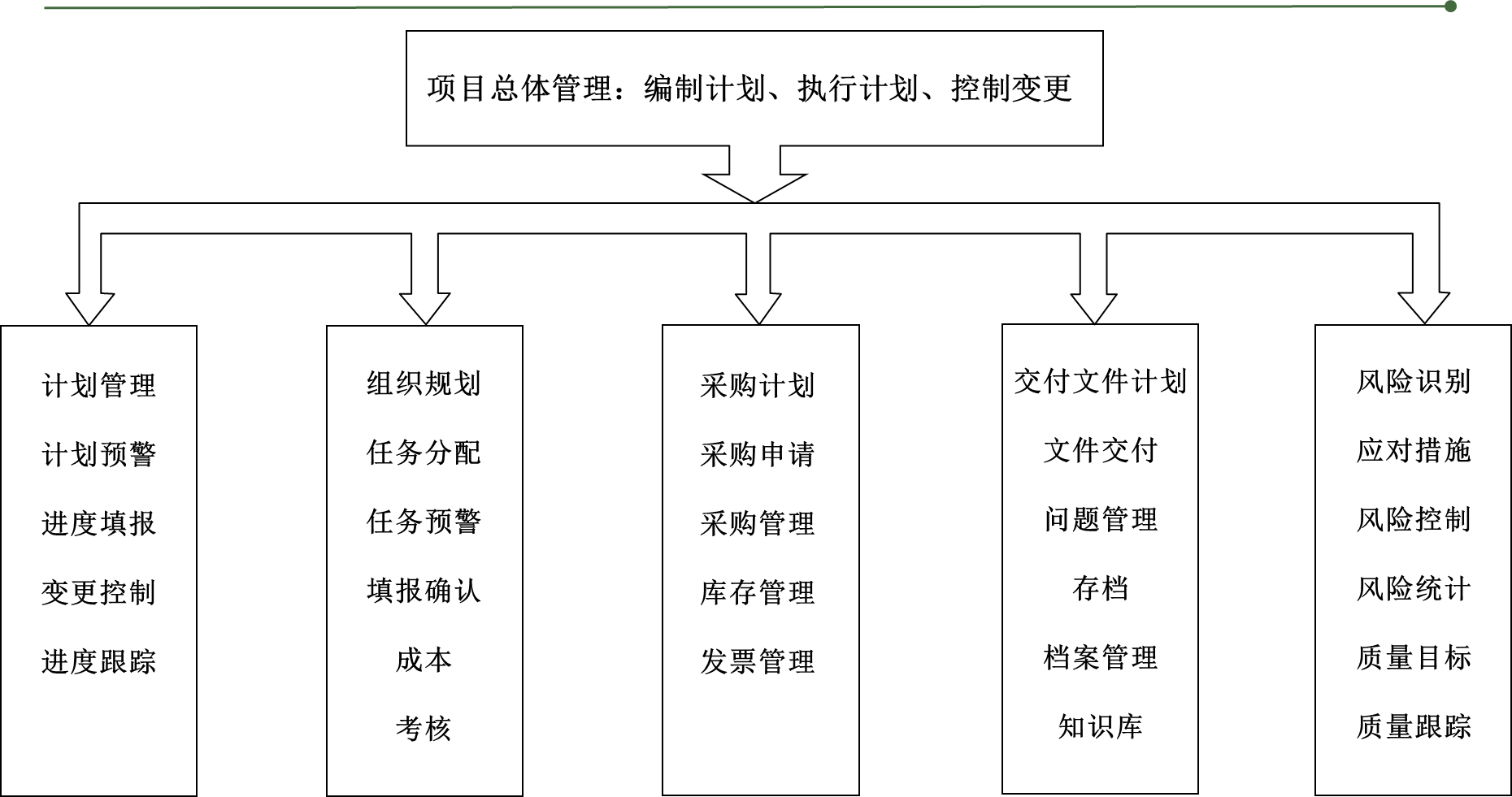 ? 系統(tǒng)建設后,需實現(xiàn)項目的全生命周期管理,實現(xiàn)客戶信息維護、合同發(fā)票、招投標、項目外包、項目計劃、計劃拆分、計劃變更、計劃達成、資源、文檔、預算、成本、分析決策等方面的全過程管理,詳細功能圖如下: