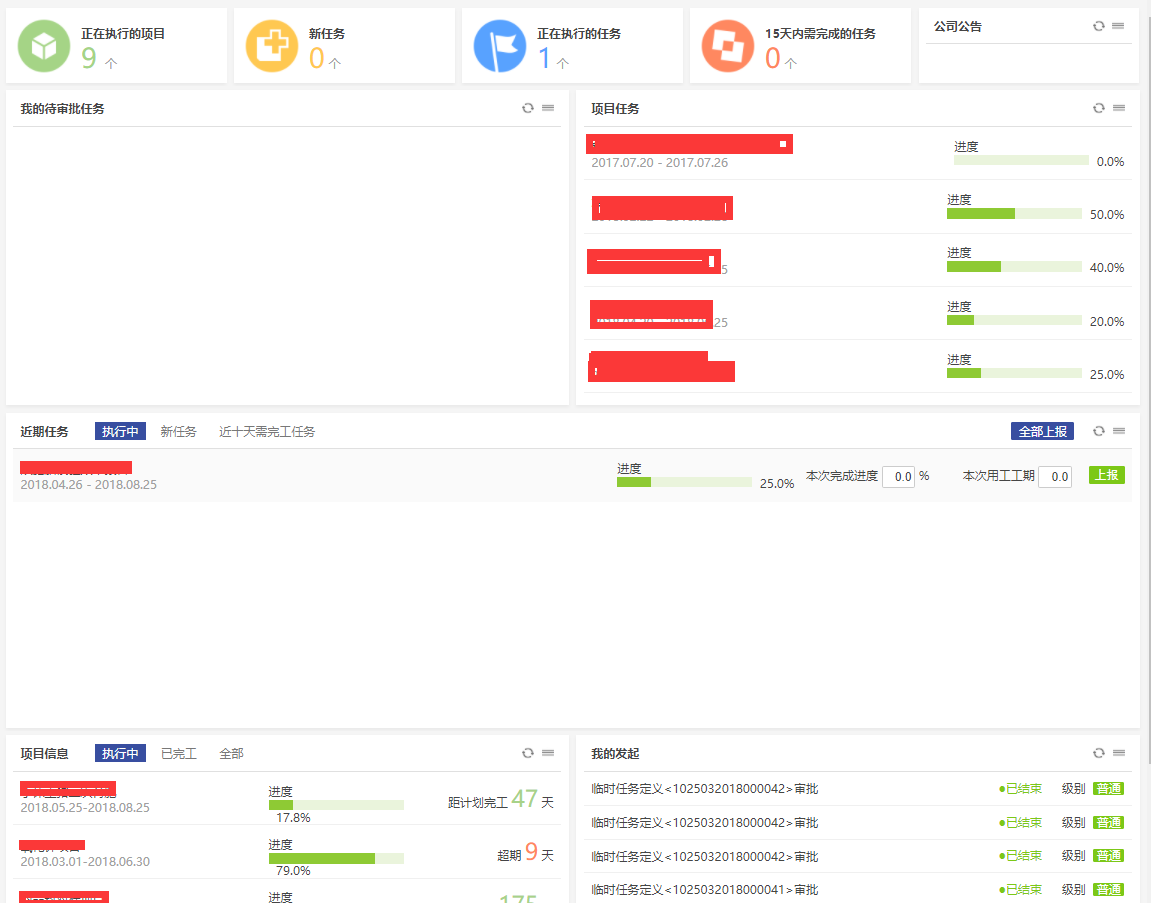 進入系統(tǒng)即可一目了然的查看正在執(zhí)行的項目,待接收的新任務(wù)、已經(jīng)執(zhí)行的項目、15天內(nèi)需要完成的任務(wù)數(shù)量及關(guān)聯(lián)任務(wù)的進度近況。且支持穿透查詢。