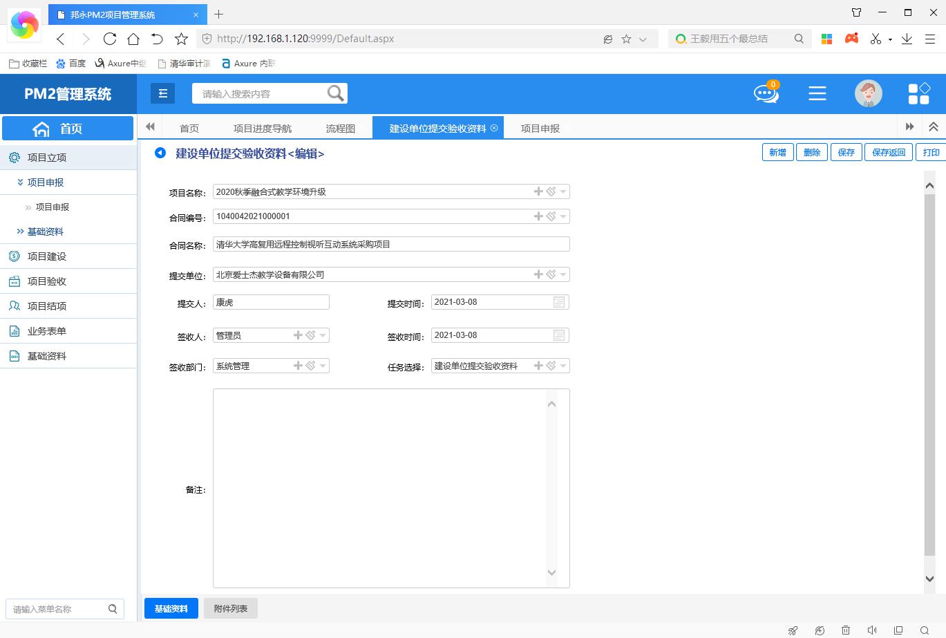 q(sh)pȝ集成目理pȝQ实C目各业务节点线上数据填写ƈ上传节点交付成果Q通过带有预警pȝ的可视化囑ŞQ将目各业务节点串联v来Ş成预警、填报、查询于一体的l合性功能。提升了用户体验Q取得了较好的效果;梳理完善了清华大学弱늳l集成项目管理体p,建立了弱늳l集成项目从x、招标文件上传、合同签订、施工进度编制、施工进度上报、项目测试报告上传、竣工文上传、验收文、项目资料归集、资产登记、资产调拨各个阶D늚业务Q完善了目节点囑Ş展示功能?qing)项目数据权限控制功能,提升了系l的可视化预警功能和数据安全功能?/p>