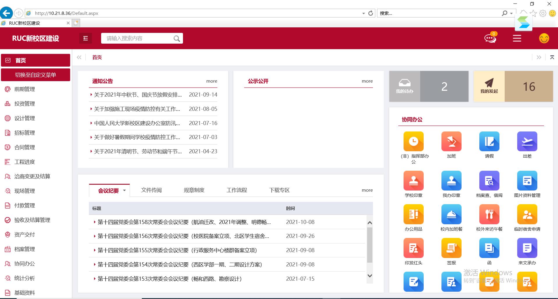 首页l过二次开发,Ҏ(gu)了h大风|之前首页的数据报表改成了以行政办公ؓ(f)ȝ面Q首|C的通知公告Q会(x)议纪要等都可以在首页直接打开查看。常用功能可以随时添加到首页昄?/p>