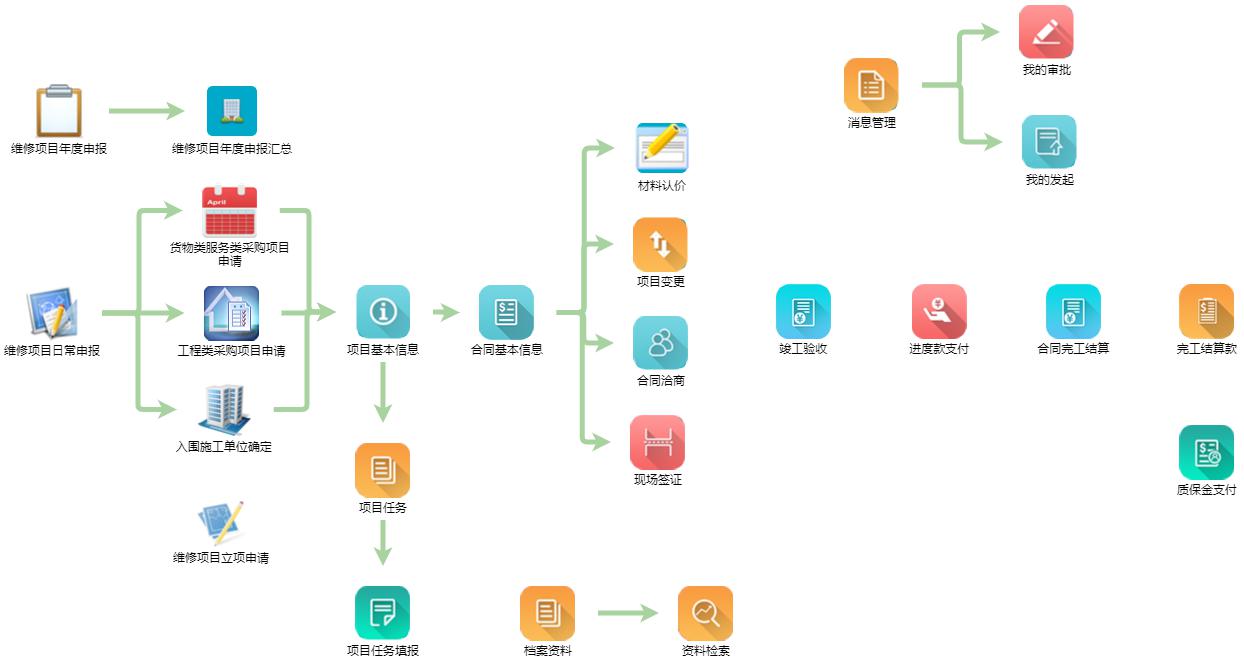 l修目主要理Q维修项目年度申报、维修项目年度申报汇怅R维修项目日常申报、货物类服务c采购项目申诗工E类采购目甌、入围施工单位确定、项目基本信息、项目案资料、项目计划进度、项目实际进度填报、合同基本信息、材料认仗项目变?、合同洽商、现场签证、进度款支付、合同完工结、完工结款支付、质保金支付?/p>