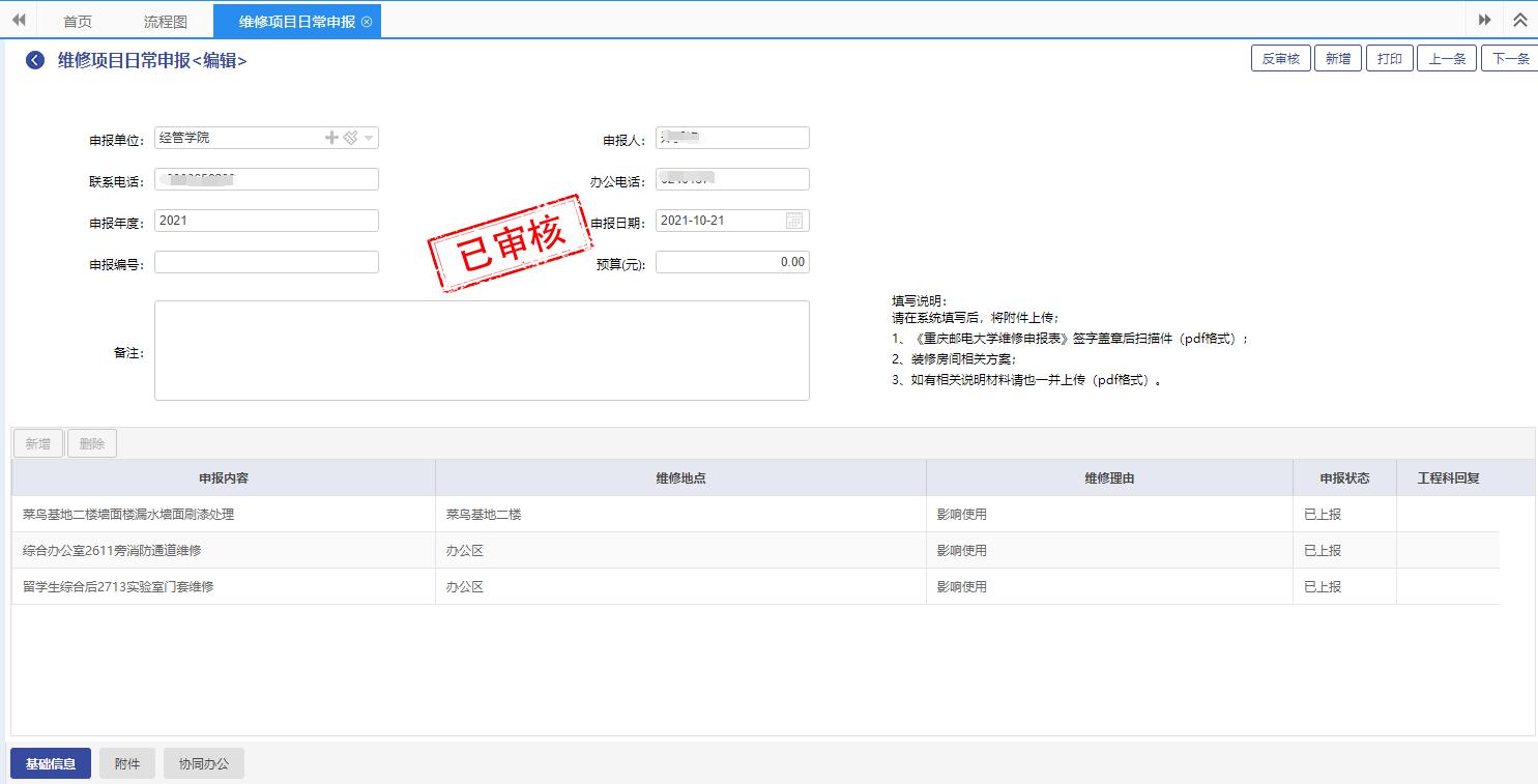 ?nbsp;信息化徏设是一个长期的q程Q随着“邦永PM2高校基徏目理pȝ”在重邮基徏处的逐步上线Q将大大提高工作效率。以前维修申报需要线下拿着一堆资料找相关人员{֭Q现在走U上Q可以少跑很多\?/p>