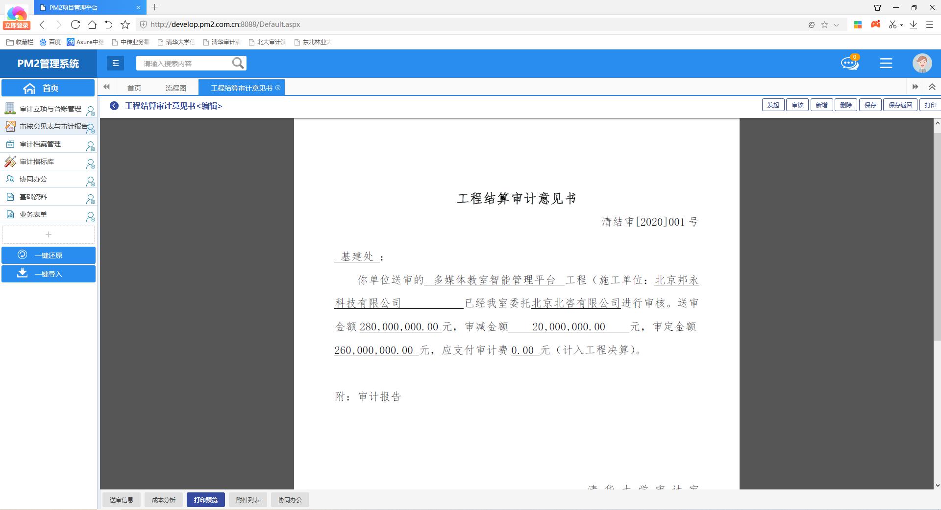 邦永PM2高校审计目理软g不仅实现?jin)工E概审计、工E结审计、全q程跟踪审计、工E决审计全程U上办理Q包括上q四业务的送审登记表、审计委托书、审核意见表、审计意见书的在U填写和自动生成Qƈ能按工程、修~工E等不同目cd建立各种指标数据库,便于后箋跟踪审计工作的g伸?/p>