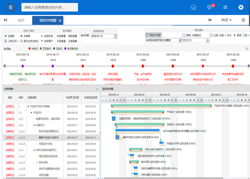 支持外部項(xiàng)目,實(shí)現(xiàn)項(xiàng)目/子項(xiàng)目無(wú)限分解;支持任務(wù)分組。甘特圖、網(wǎng)絡(luò)圖(單代號(hào)、雙代號(hào))、工作日歷、邏輯圖等多種工具從不同側(cè)面展現(xiàn)項(xiàng)目進(jìn)度與計(jì)劃,關(guān)鍵路徑自動(dòng)計(jì)算;用戶自定義圖形顯示方式。項(xiàng)目模版形成企業(yè)的標(biāo)準(zhǔn)項(xiàng)目流程。
