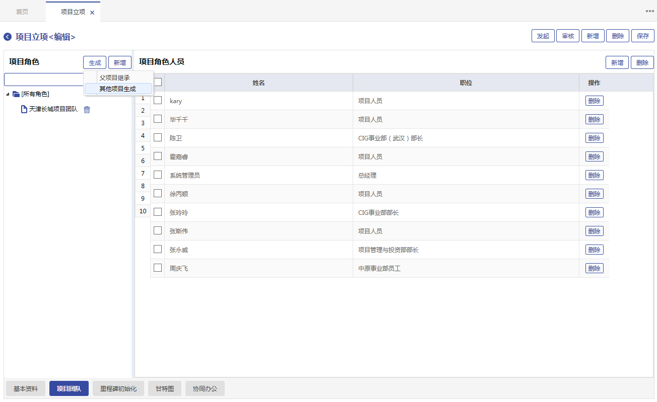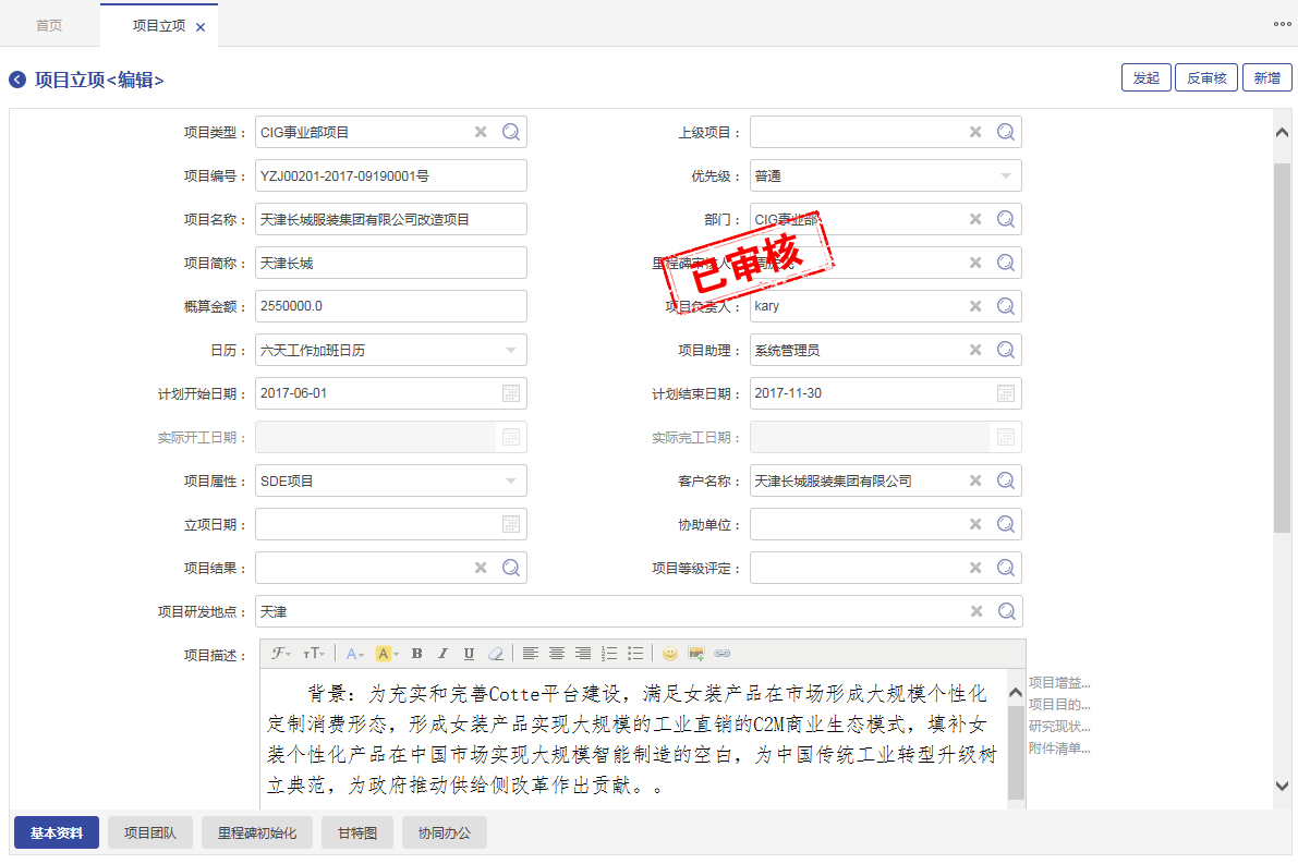 當(dāng)公司決定要新上一個(gè)項(xiàng)目時(shí),首先要把項(xiàng)目信息在系統(tǒng)中做立項(xiàng)審批,比如項(xiàng)目的名稱(chēng)、負(fù)責(zé)人、預(yù)算金額、客戶(hù)名稱(chēng)、里程碑計(jì)劃、項(xiàng)目團(tuán)隊(duì)信息等,上傳項(xiàng)目相關(guān)電子文檔、發(fā)起立項(xiàng)會(huì)簽。