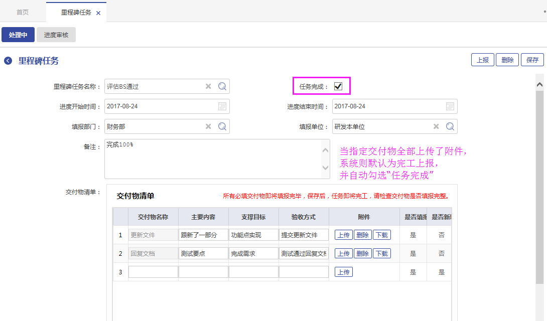 可以直接填報(bào);也可以點(diǎn)擊詳細(xì)填報(bào),如果要上傳交付物,則需要點(diǎn)擊“詳細(xì)填報(bào)”。支持包括臨時(shí)任務(wù)在內(nèi)的多任務(wù)快捷填報(bào)。里程碑任務(wù)支持支撐目標(biāo)、驗(yàn)收方式等交付物清單的填寫(xiě)。項(xiàng)目任務(wù)責(zé)任人上傳交付成果文件。進(jìn)度審核后生效。
