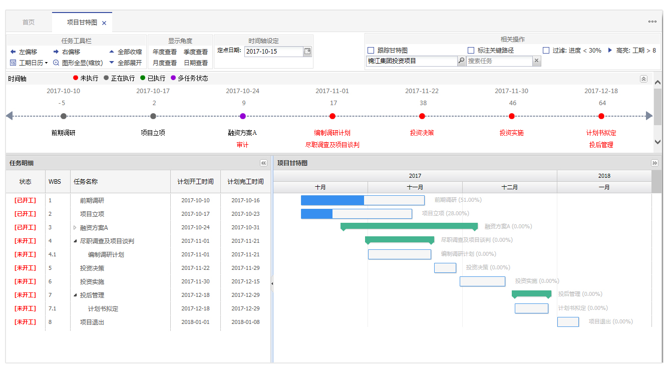 ●  支持按項(xiàng)目分類(lèi)設(shè)置、引用WBS模板,快速編制項(xiàng)目計(jì)劃,甘特圖顯示。