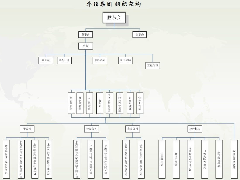 中國(guó)上海外經(jīng)(集團(tuán))有限公司是經(jīng)國(guó)家商務(wù)部(前外經(jīng)貿(mào)部)和上海市人民政府批準(zhǔn)成立的綜合涉外國(guó)有企業(yè)。凈資產(chǎn)近8億人民幣,總資產(chǎn)35億人民幣,擁有6家全資子公司、3家控股公司和10個(gè)常駐境外機(jī)構(gòu),業(yè)務(wù)涉及138個(gè)國(guó)家或地區(qū)。集團(tuán)以國(guó)際工程承包為核心業(yè)務(wù),主要有五大產(chǎn)品:民用房屋土木工程、工業(yè)成套設(shè)備工程、現(xiàn)代農(nóng)業(yè)工程、工程配套咨詢、工程配套服務(wù)貿(mào)易。其中,成套設(shè)備工程是我集團(tuán)五大拳頭產(chǎn)品之一,分別承接了緬甸照濟(jì)電站、蒙古都日根電站、越南山洞電站、泰國(guó)BNS鋼廠、巴基斯坦液化氣儲(chǔ)罐等超過(guò)600個(gè)項(xiàng)目。
