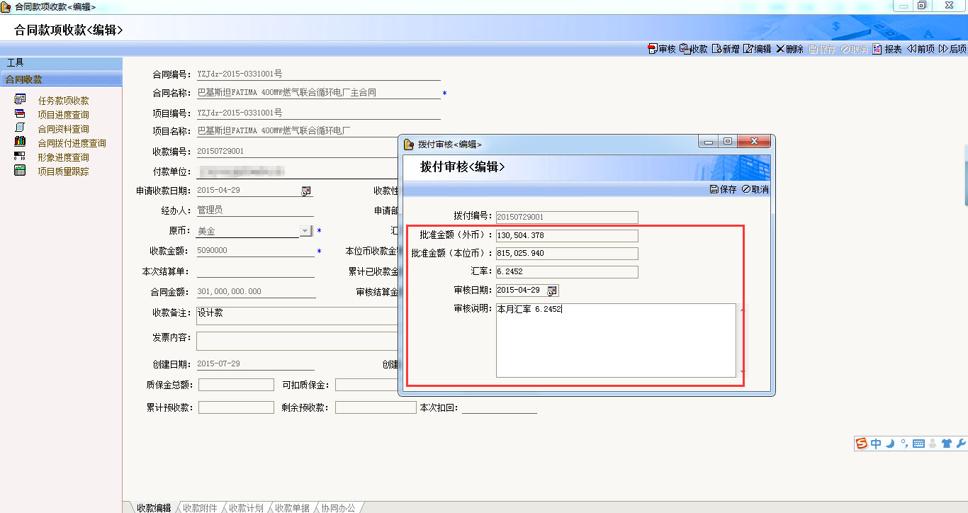• 資金核算:項(xiàng)目合同簽訂時(shí)大多數(shù)是以外幣簽訂,但是在項(xiàng)目合約部發(fā)起收款時(shí),很難知道當(dāng)時(shí)的匯率或者實(shí)際到賬和當(dāng)時(shí)的匯率不一致,項(xiàng)目合約部發(fā)起項(xiàng)目收款時(shí)無(wú)需關(guān)心當(dāng)時(shí)的匯率,財(cái)務(wù)去銀行辦理相關(guān)手續(xù),在審核相關(guān)資料后,實(shí)時(shí)填報(bào)當(dāng)時(shí)的匯率,系統(tǒng)會(huì)自動(dòng)保存本位幣和外幣,避免了每次財(cái)務(wù)雙重賬記賬的煩惱;