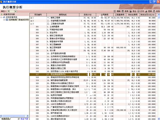 在項(xiàng)目的不同階段(立項(xiàng)階段、準(zhǔn)備階段、實(shí)施階段),按照建設(shè)項(xiàng)目、子項(xiàng)目、單項(xiàng)工程、單位工程、各專業(yè)分部分項(xiàng)工程進(jìn)行分解及管理,實(shí)現(xiàn)投資控制。明確各個(gè)階段的增減內(nèi)容和投資變動(dòng)以及各“算”間的相互差異,并根據(jù)項(xiàng)目建設(shè)管理需要,定期生成差異總表,分年投資計(jì)劃。如圖五執(zhí)行概算分析表。