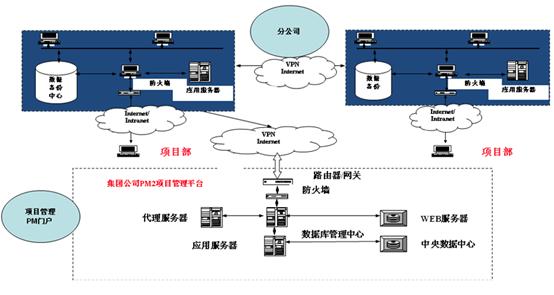 項(xiàng)目現(xiàn)場(chǎng)又包括分公司、技改指揮部、項(xiàng)目公司和監(jiān)理公司三個(gè)子網(wǎng)。遠(yuǎn)程用戶通過(guò)VPN連接或直接通過(guò)PM2遠(yuǎn)程管理功能進(jìn)行訪問(wèn)。