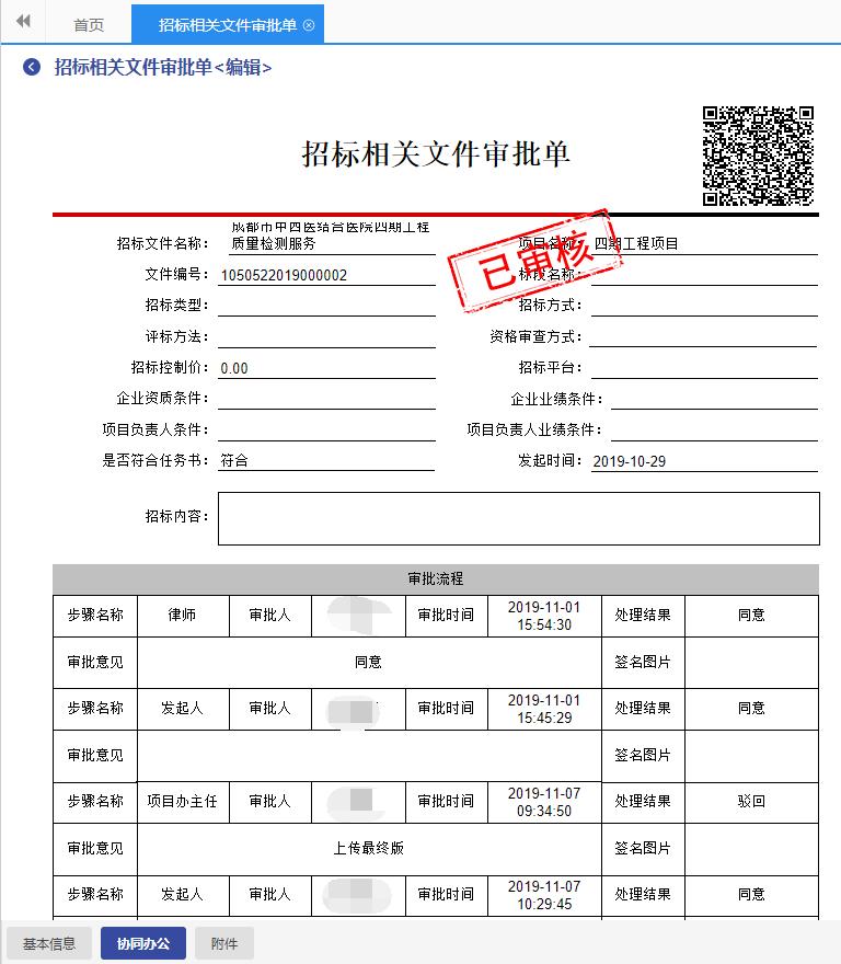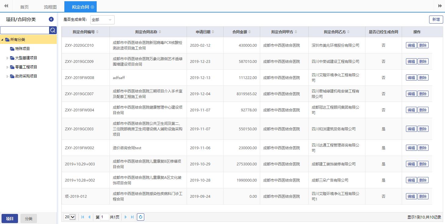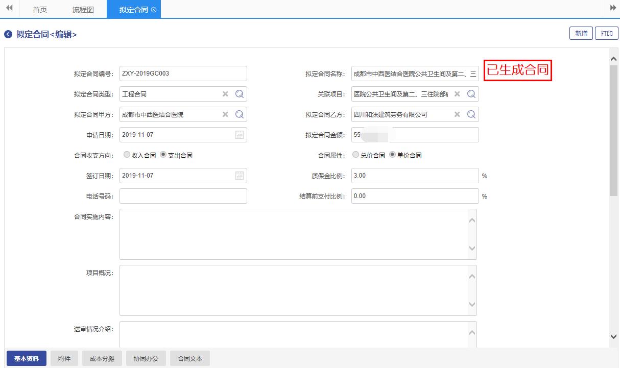供應(yīng)商單位起草合同文本,發(fā)起審批,經(jīng)過項(xiàng)目辦、律師事務(wù)所審批通過后,生成可執(zhí)行的正式合同。
