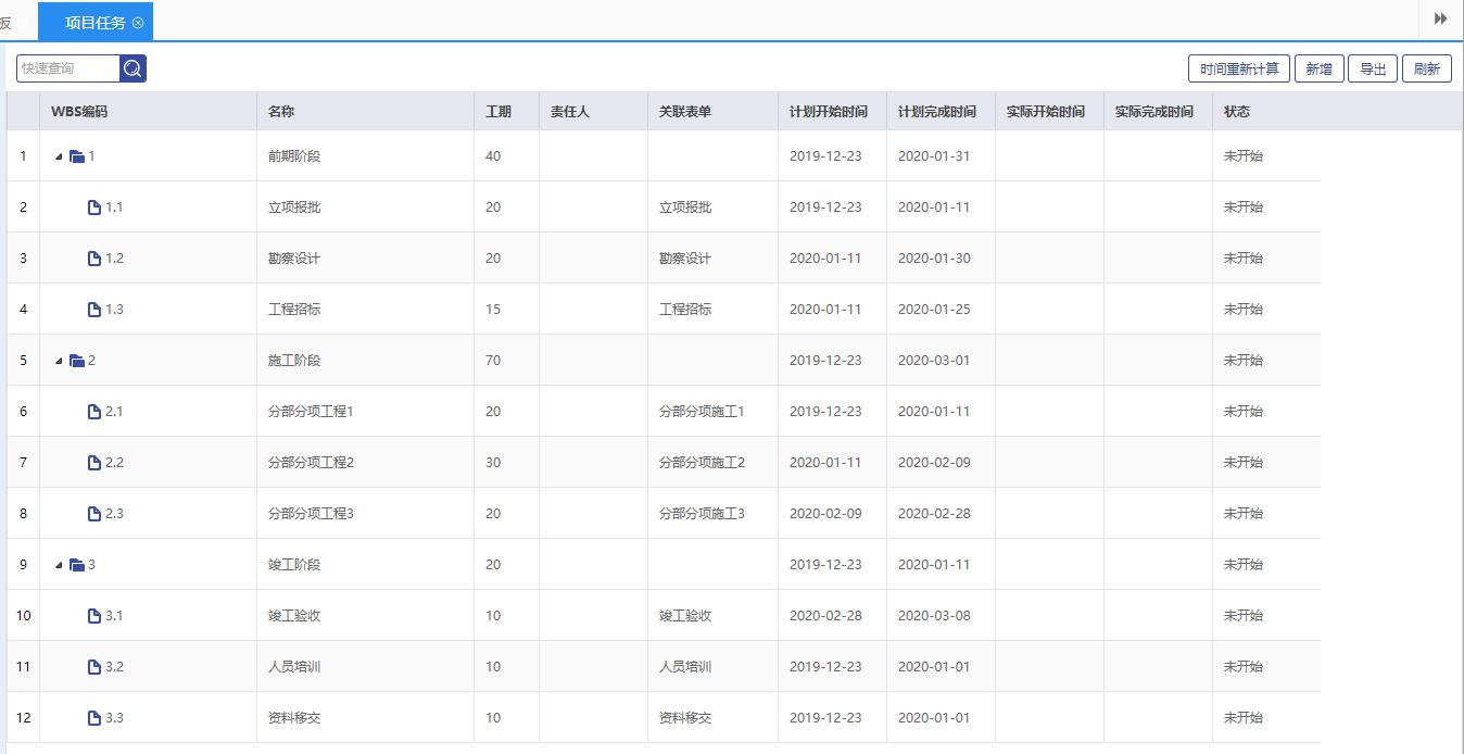項(xiàng)目全生命周期的計(jì)劃管理包括前期階段、施工階段、竣工階段等。將每個(gè)階段再分解為若干個(gè)形象任務(wù)進(jìn)行實(shí)施,同時(shí)各階段任務(wù)之間基于業(yè)務(wù)本身形成邏輯關(guān)聯(lián),以體現(xiàn)各任務(wù)配合情況及相關(guān)任務(wù)計(jì)劃執(zhí)行情況對(duì)項(xiàng)目總體計(jì)劃的影響。