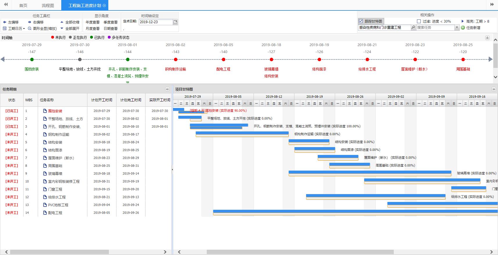 制定施工階段中各分項(xiàng)施工任務(wù)的時(shí)間進(jìn)度計(jì)劃、任務(wù)材料需求計(jì)劃、人力資源配備計(jì)劃、設(shè)備需求計(jì)劃、費(fèi)用支出計(jì)劃等等方面,通過形象化的進(jìn)度圖對(duì)工程進(jìn)行計(jì)劃編制及實(shí)際進(jìn)度跟蹤,實(shí)時(shí)掌握工程的當(dāng)前狀態(tài)和后續(xù)進(jìn)展情況。