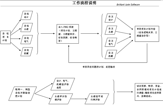 結(jié)合以上功能模塊的使用,作為數(shù)據(jù)來源使用項(xiàng)目跟蹤、項(xiàng)目評(píng)估、風(fēng)險(xiǎn)分析,為領(lǐng)導(dǎo)層提供決策支持報(bào)表數(shù)據(jù),以加強(qiáng)對(duì)在建項(xiàng)目的控管、優(yōu)化待建項(xiàng)目的計(jì)劃。以下是關(guān)于項(xiàng)目計(jì)劃與進(jìn)度跟蹤的一個(gè)簡單使用流程,便于各職能組明確結(jié)合軟件使用的工作內(nèi)容。